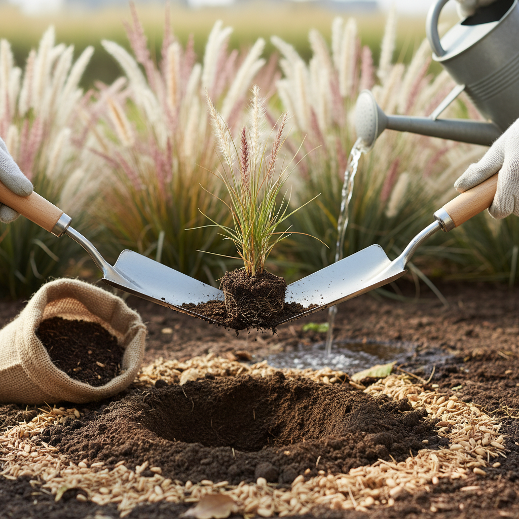 - Duobės kasimas: Iškaskite duobę, kuri būtų bent dvigubai arba net trigubai platesnė už sodinuko šaknų sistemą, tačiau lygiai tokio paties gylio kaip vazonėlis. Miskantų šaknys labiau linkusios plėstis į šalis nei skverbtis gilyn, todėl platus, išpurentas plotas aplink leis joms be kliūčių augti.